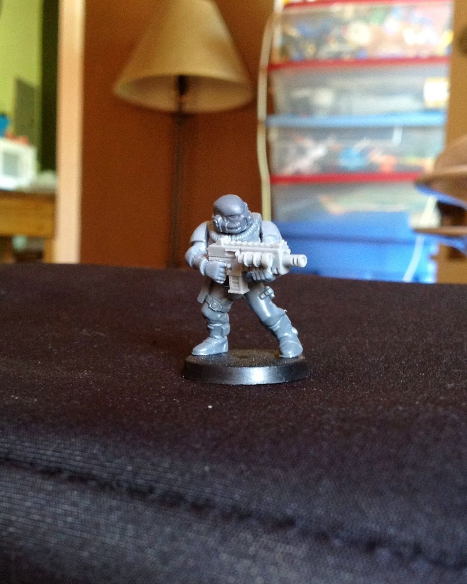 Using Firepower's simple helmet conversion and a custome bolter from Anvil Industry. Swapped magazine for drum (not pictured). More to come.