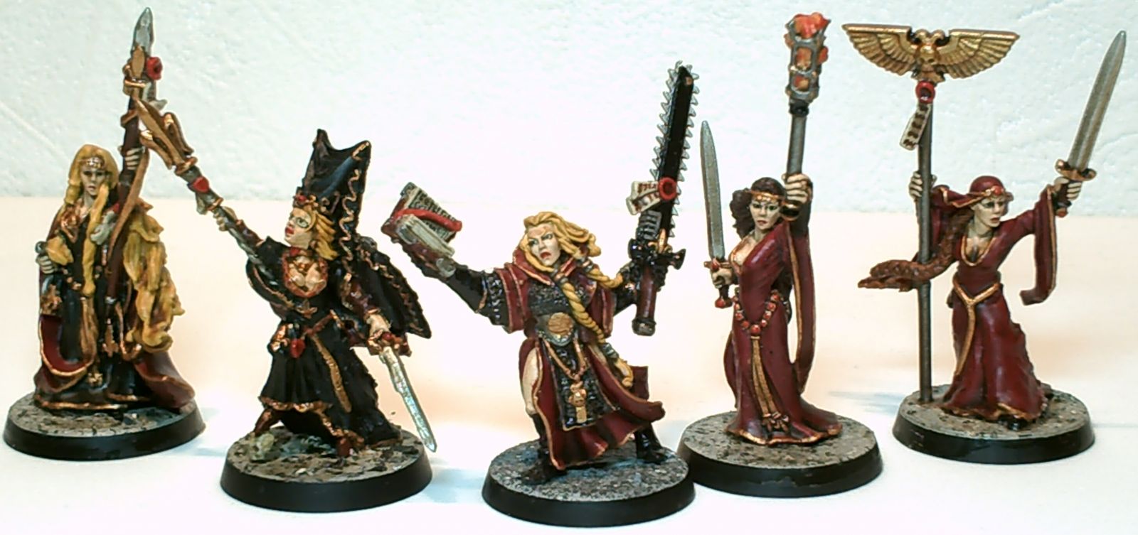 A bunch of models initially intended to be non-militant Sisters (Famulous, Dialogus), in case I'd ever need one. Mostly used as test-models for experimentations in painting, varnishing, washing and green-stuffing. Now of course they come in quite handy as female Priests.