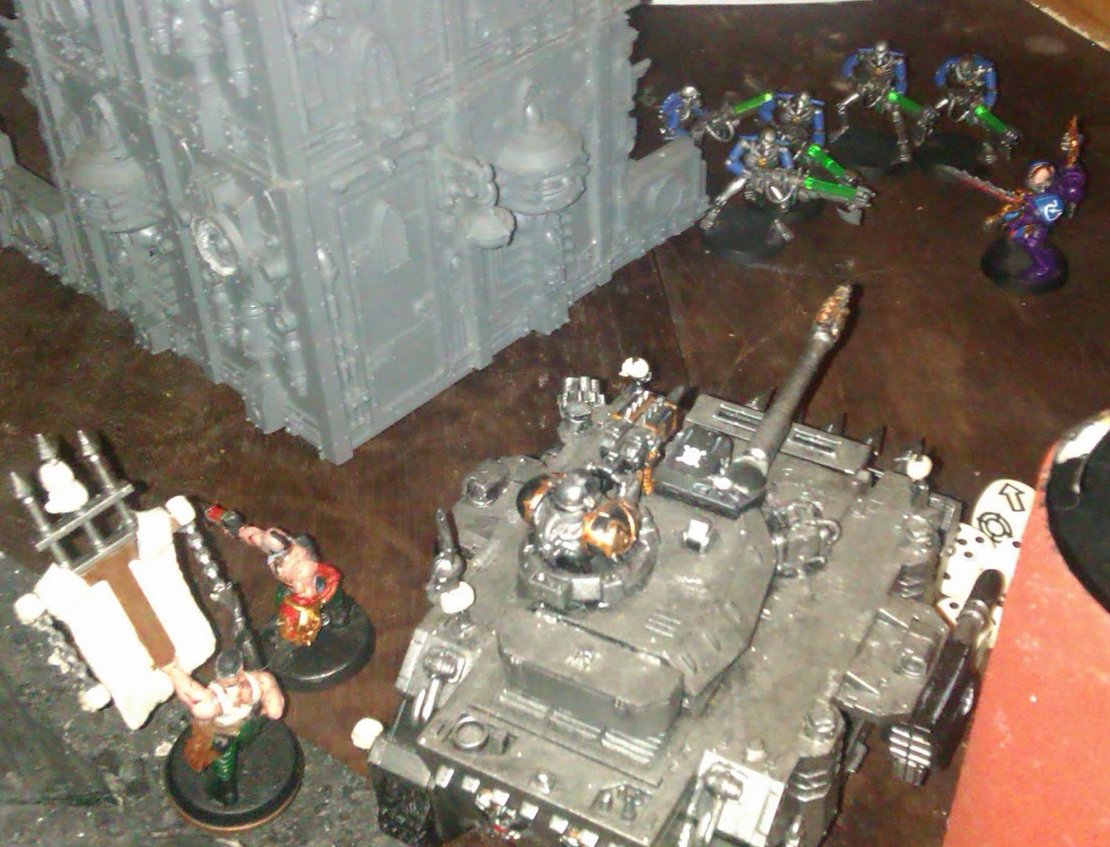 While Robersium is still emerging from combat, the Iron Warrior Predator aims its weapons at the Barge (on opposite side of the board) and delivers a punishing salvo