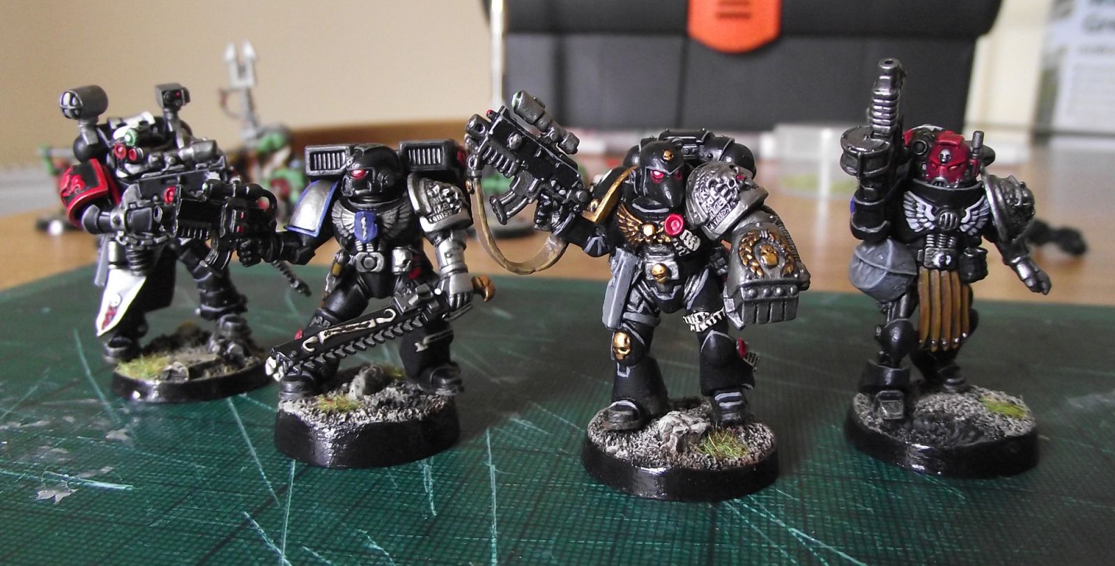 Here are the finished members of the Killteam (there's two members missing who are currently in the process of being fixed up). Excluding Otarn, all members of the Killteam were made to represent the player characters of me and my friends and at the time tried to cover all bases, making sure we had at least one of each class (missing are the Devastator and Librarian characters).