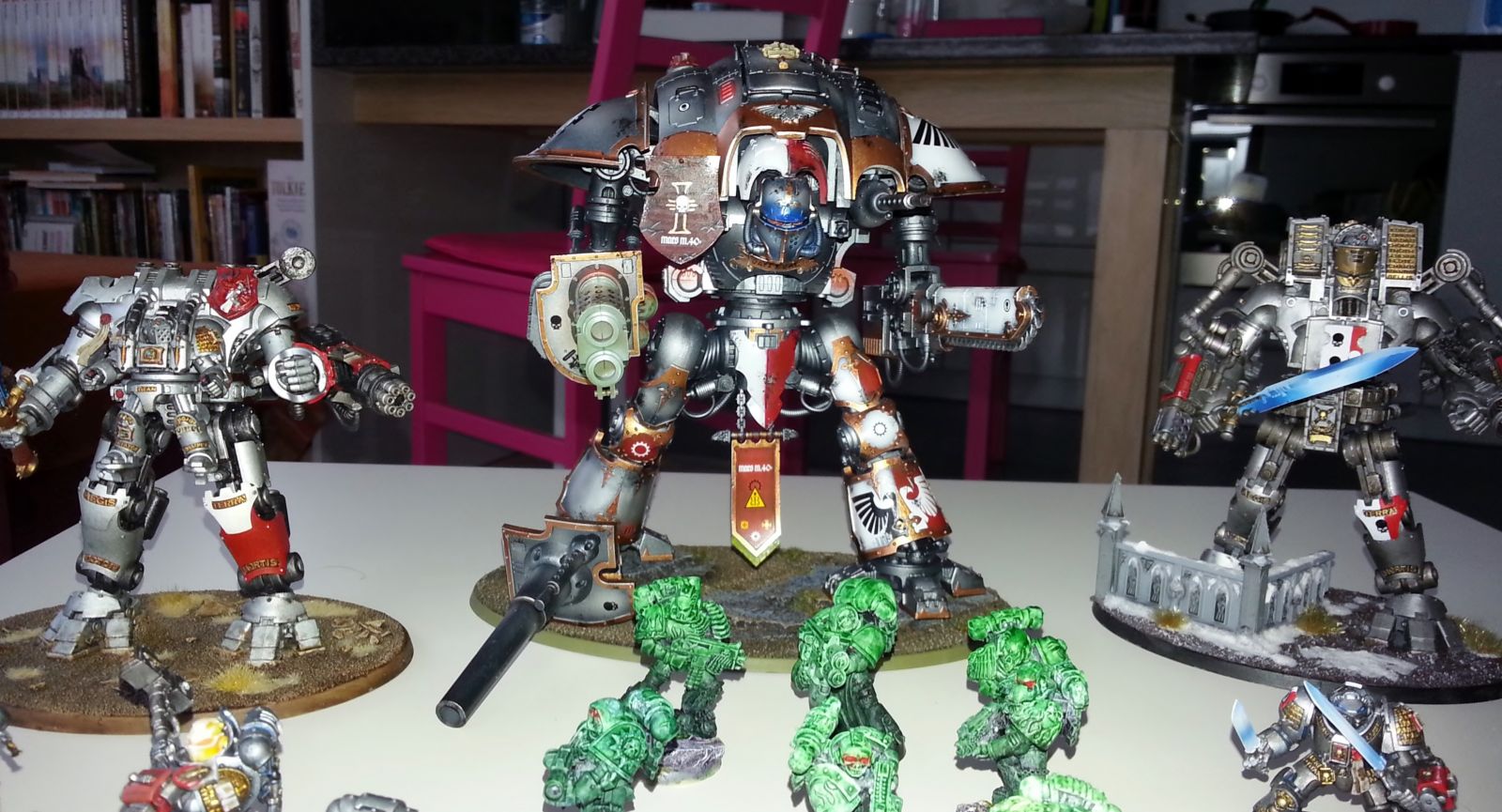 Imperial Knight Free Blade Odysseus in the service of the Inquisition and usually supporting the 9th Brotherhood along with the two Dreadknights. Brother Ishmael and Venerable Brother Icarus. Brother Icarus had initially been placed in a Dreadnought suit but after a series of malfunctions it was decided to try and pioneer a new, more suitable interface to allow him to pilot a Dreaknight.