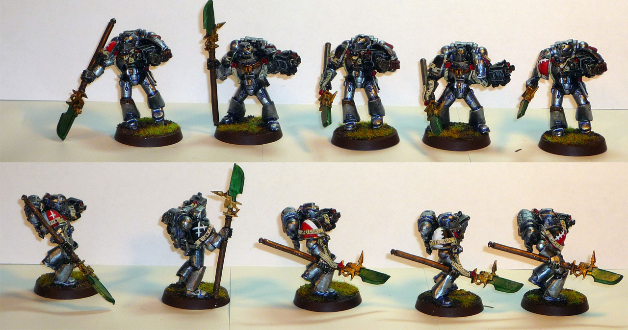 Half of my new Grey Knights squad. The GKs pictured here are Brothers Rhamius, Eiskar, Julian, Nicklaus, and Bargus.