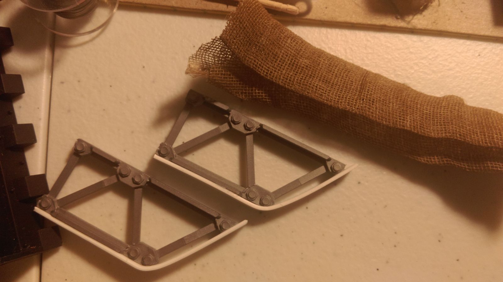 This is the first version I attempted. This one is very simple, based off a terrain box I had laying around and a small strip of plasticard. I put two 1/8 inch magnets on the side abutting the rear of the tank. I liked the removable aspect of them, but they were really long. In terms of realism it might make more sense than my subsequent designs, but it just wasn't all that practical.