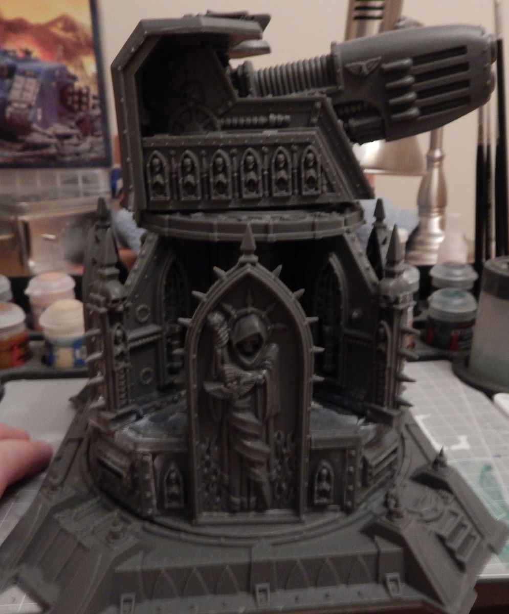 This is my first attempt at a structure. It's called a Plasma Obliterator and is essentially a big pillbox with a giant plasma gun sitting on the roof. Being a Dark Angels fan with a bit of a plasma fetish, I simply had to have it. I am told this thing was a limited edition model or something; I don't know, I bought the only one on the shelf so maybe I was just in the right place at the right time. It was pretty easy to build, although some of the support beams had to be Green-stuff'd as I couldn't get them to snap into place just right. But all in all, I think it's going to be fun to play with. It's AV 14 with shooting points all around it (I imagine it holds maybe 10 guys?). The top is a 360 degree turret with a 72", AP2 massive blast (I think that's 7"?). Anyway, it still Gets Hot though where units suffer D3 wounds I think. I just can't wait to add some wings and DA iconography to it, I think it's a pretty neat-looking tower.