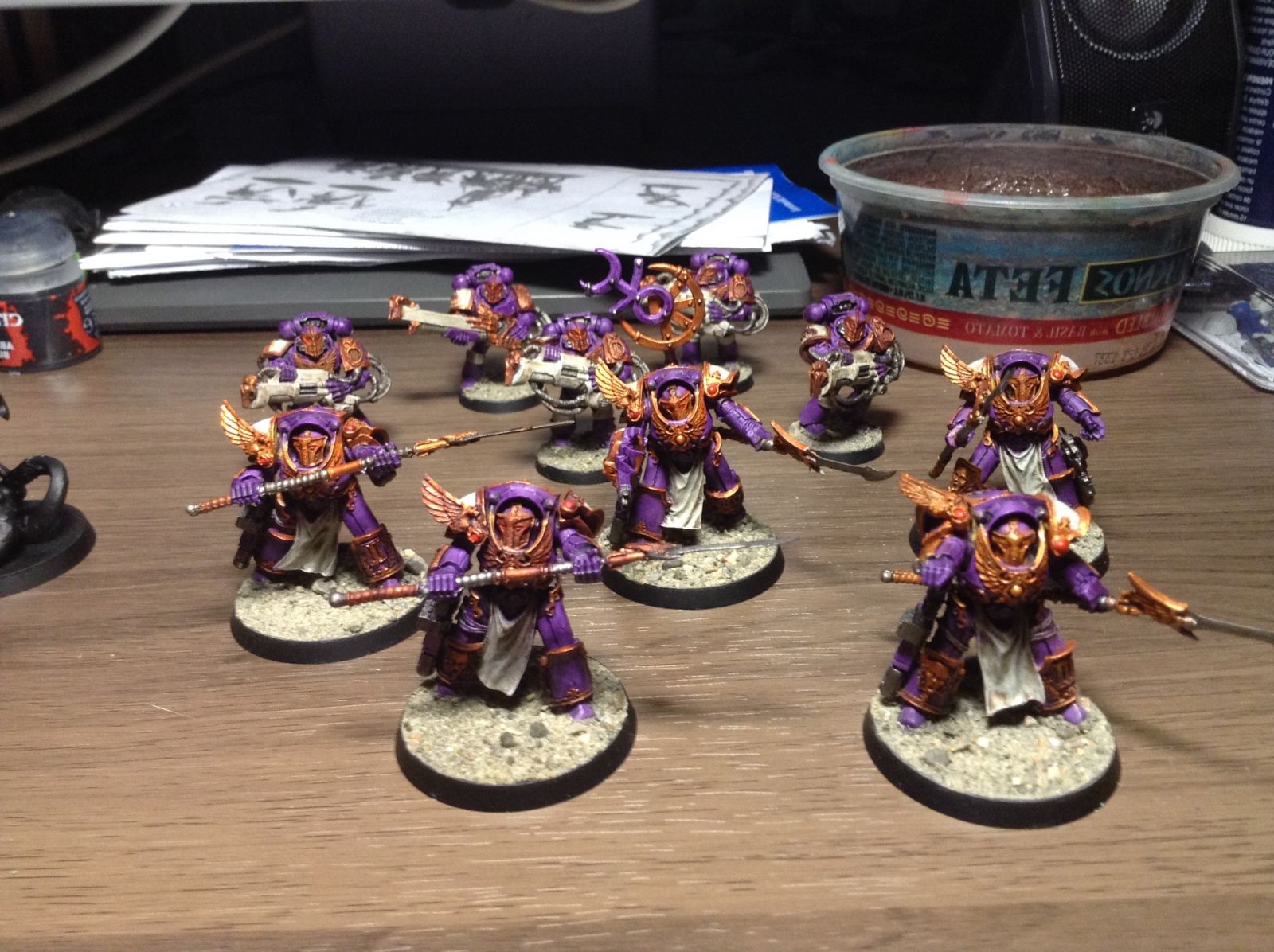 A front view of my Phoenix Terminators and their conversions that allow 40K use. Can also function as a teleporting Terminator squad for a legion army in an Orbital Assault list. Notice the Chainfist, Icon of Excess, and Combi-Meltas.