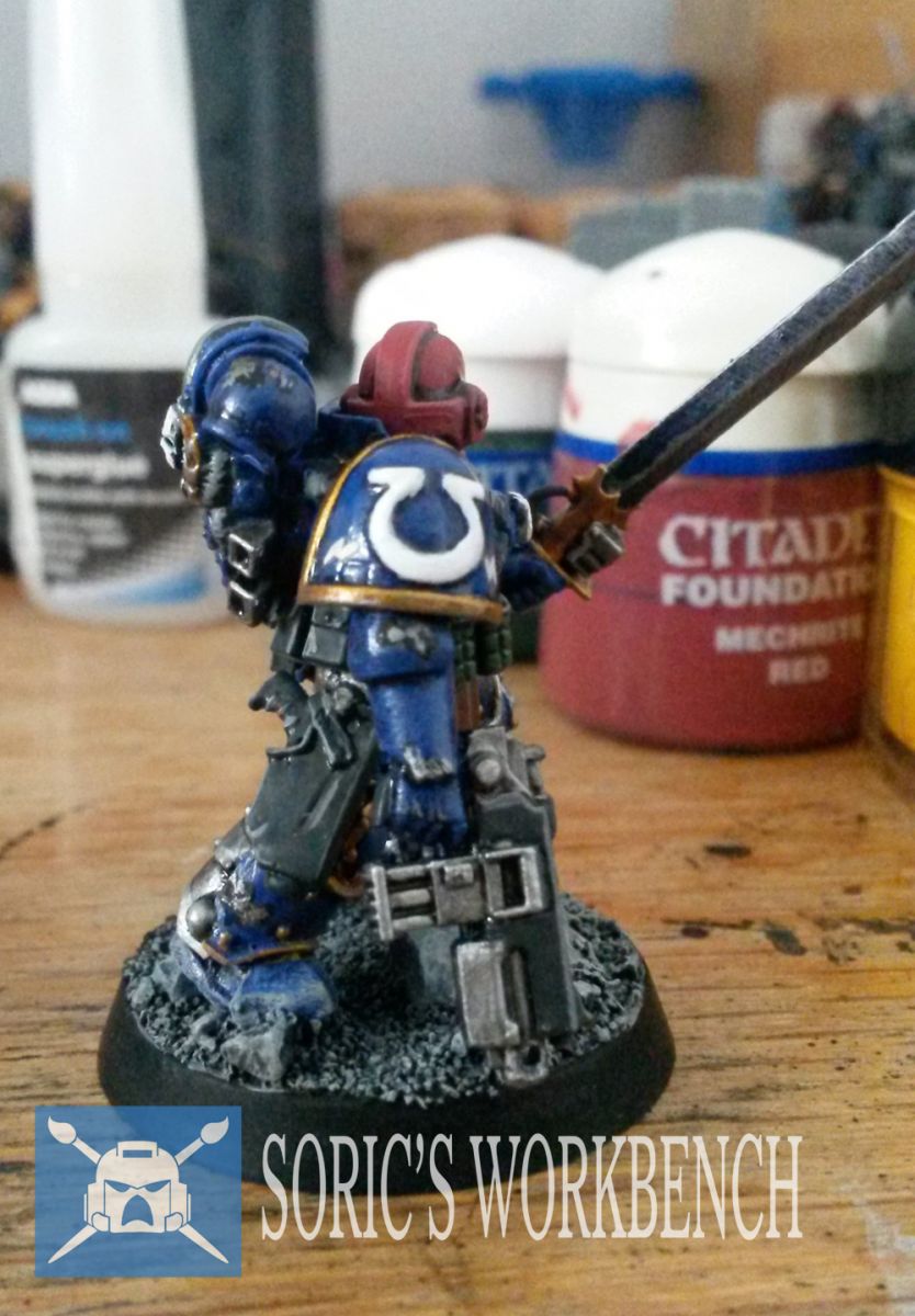 A shot of Thiel's shoulder pad with the molded Ultima from the Ultramarines upgrade sprue.