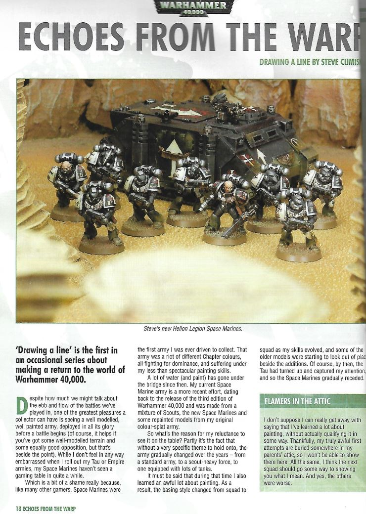 Within the hallowed pages of White Dwarf 297 (Published September 2004, also my very first copy of the magazine.) One shall find the first appearance of the Helion Legion in a article about one hobbyist's project to revive an old chapter concept using (then) up to date models. This article gave many hobbyists a fairly in depth look at the chapter's inspirations, livery, history and a How-To section so others can build, paint and play the Helion Legion chapter themselves.