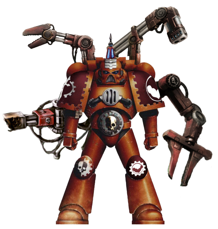 A Castigators Techmarine. Note: Personal heraldry on left polyen (knee guard). A simplified Mechanicus cog symbol with a red coloured Castigators Chapter icon.