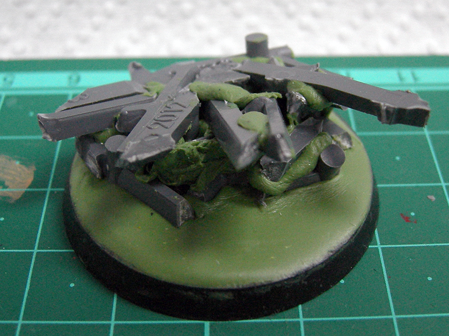 Trim any stray sprue bits down, and fill in any large gaps with either millistuff or smaller bits of sprue. Once you've got an overall shape you're happy with, let things dry so they're not shifting around for the next part.