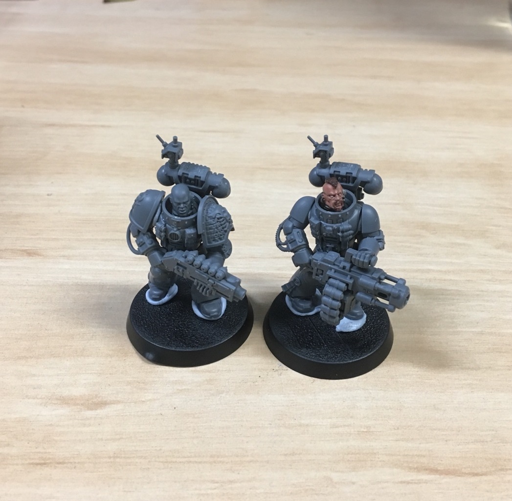 My last 2 vets for my first squad of DeathWatch, space wolf Frag Cannonier and Brazen Minotaur shotgunner.