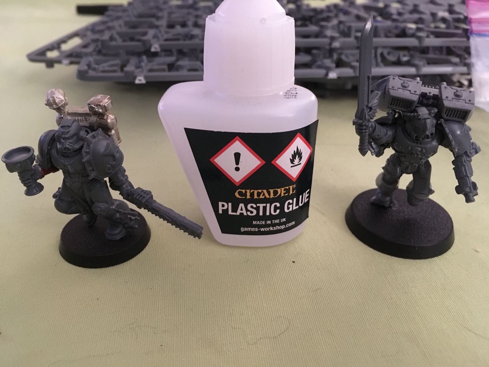 Assembled Brother Corbulo Kitbash (Grail and ches from the Blood Angels upgrade sprue, pauldrons, chainsword arm, legs from Death Company sprue, backpack from an Apothecary/Sanguinary Priest pewter blister) and Captain with Jump Pack (Power Sword, chest front, one pauldron from Death Company Sprue, head and other pauldron from Blood Angels upgrade sprue, legs, back of chest and jump pack from Vanguard Veterans sprues).