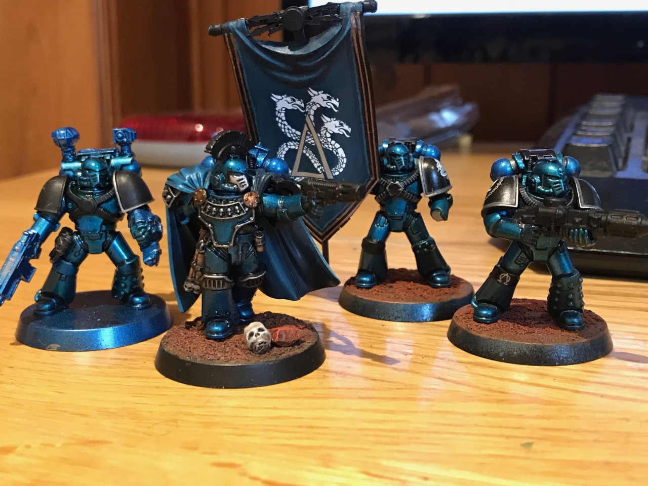 Command Squad in progress. I am considering changing the helm of the commander to something more AL themed. He will also be given a big spear.