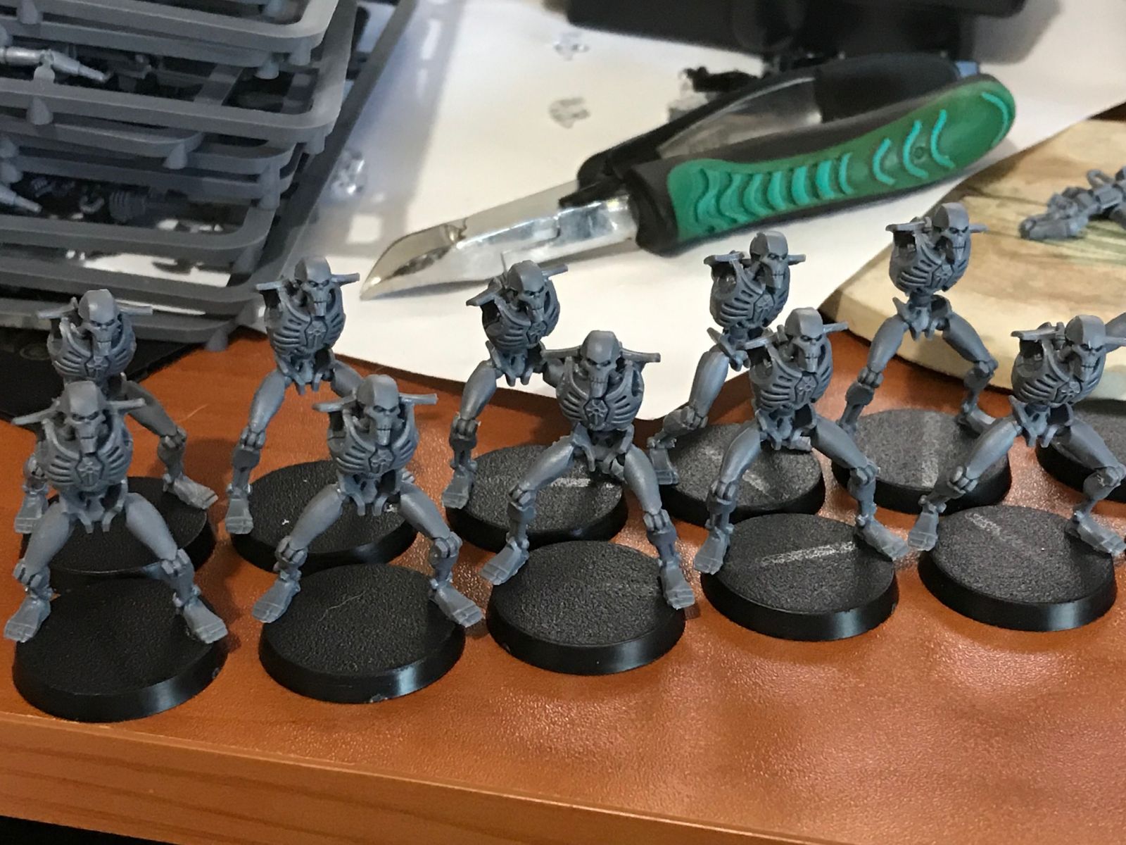 Glueing the torsos onto the legs 12 at a time.