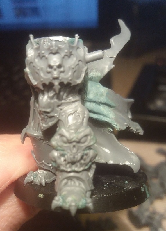 Innitial steps on my Lord. Did I mention that I am a sucker for clawed feet? The knee pad is an armor detail from the Venom Crawler and an Oblit leg piece. The chestplate is made from two different Blood Warrior chest plates and some wings from an Undead figure. The came are different pieces from the Knight of Shrouds kit.