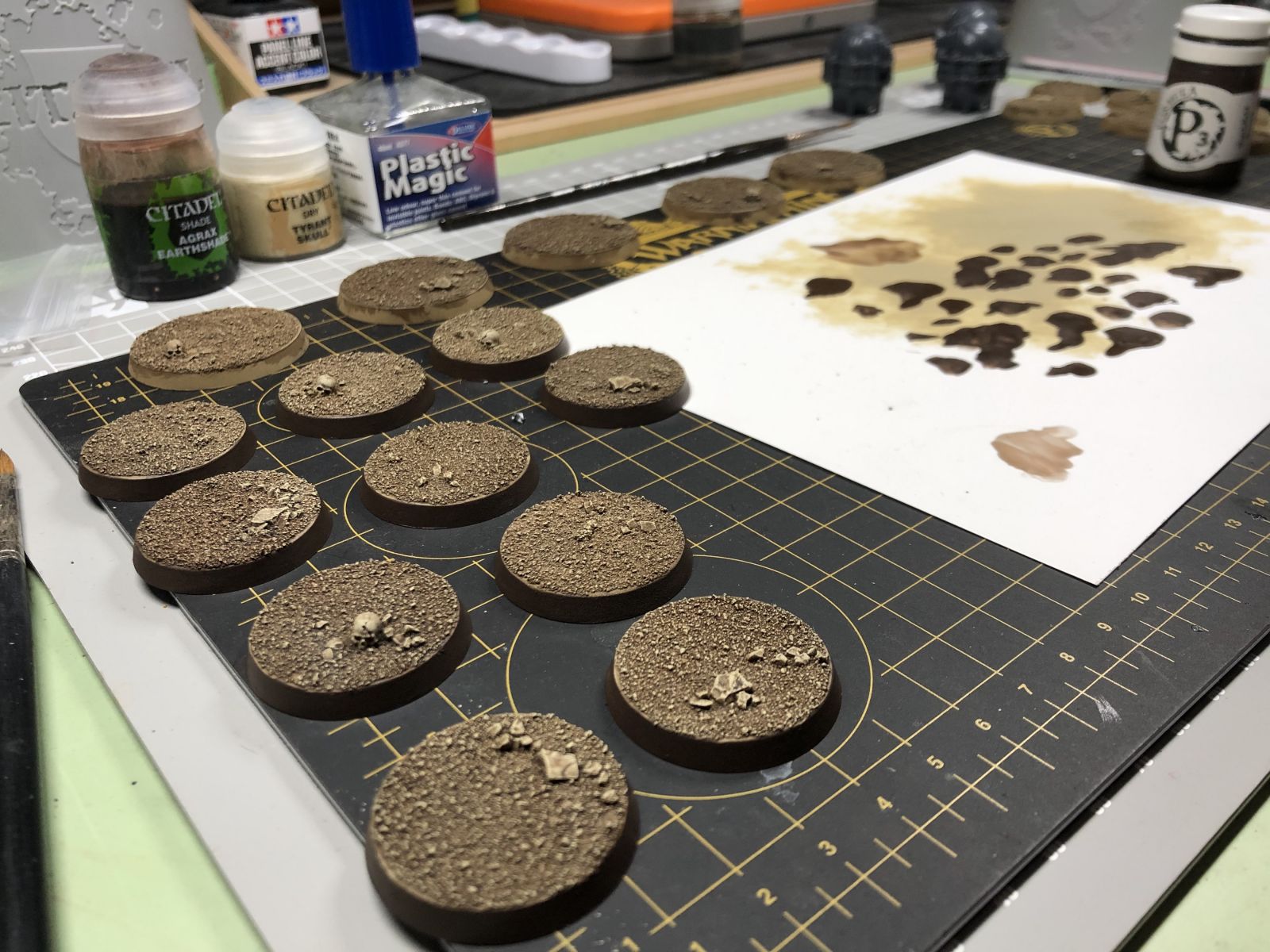 Bases for my initial Night Lords 30k army - basic GW/Citadel sand flock with GF9 rocks and GW/Citadel skulls. Primed/basecoated with Zandri Dust spray (GW), washed with Agrax Earthshade (GW), dry-brushed with Tyrant Skull (GW). Rims done in Battlefield Brown (P3).