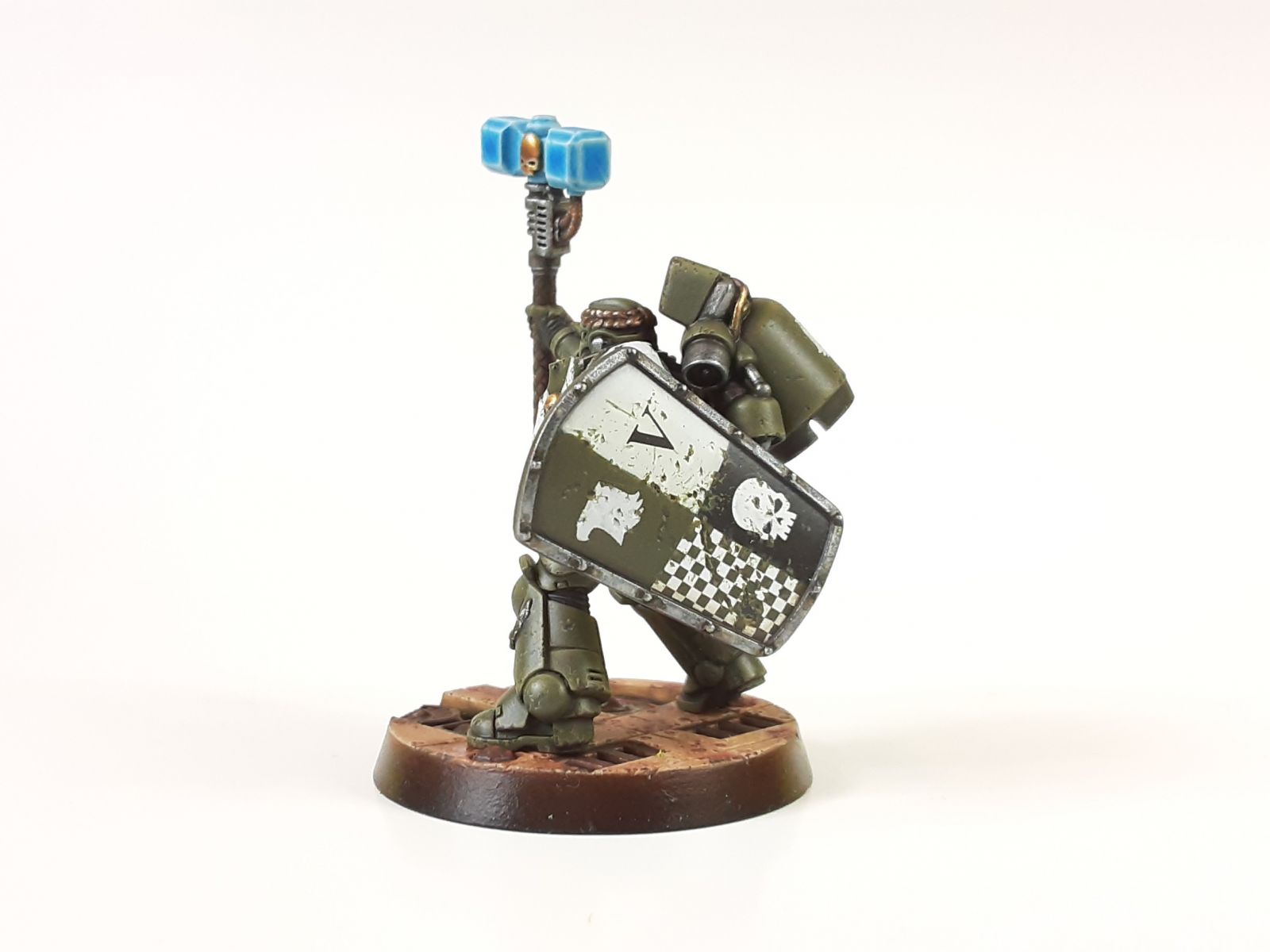 This guy is my Smash Captain. He's a conversion of the space marine Primaris Lieutenant with a conversion kit (jump pack, thunder hammer and storm shield) from Pop-goes-the-Monkey on Shapeways.