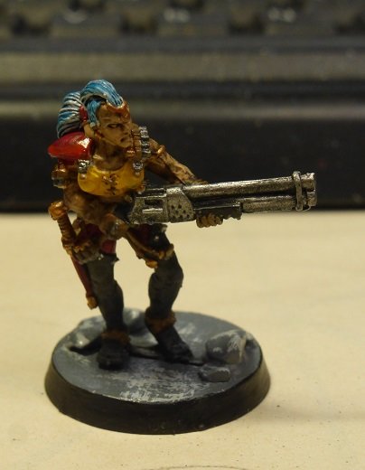 A lone ooP metal model taht was supplied with a heavy stubber model. the latter was cut into pieces to get only its head saved and set on a Eldar Vyper Gunner. Painted this one thinking that, if I one day field an Inquisitorial REtinue, it could be a member of choice for this unit... Because I will not start any Gang for Necromunda.