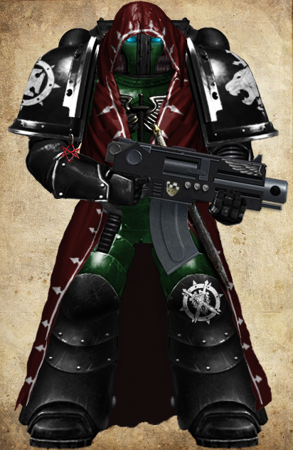 Pictured Above: Lions Malevolent Veteran Marine of the elite 1st Company ('Knights of the Lion'). Note: Veteran status and membership into the Chapter's Inner Circle is indicated by the wearing of maroon robes.