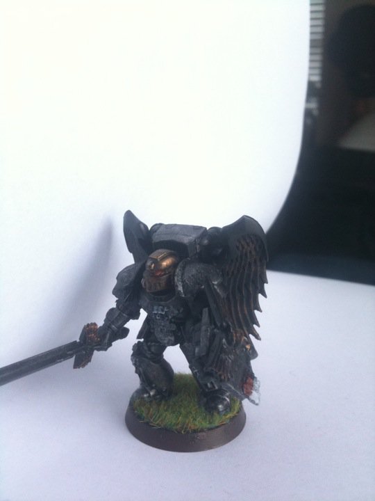 I am rather proud of this one. The sword is a conversion from the the Sanguinary Guard kit. The shield is the power armor storm shield from the Assault Squad kit glued to the bolt pistol with the top of the chapter banner from the Sanguinary Guard kit glued over the eagle. The legs, torso, helm, bolt pistol, and sword arm come from the Death Company kit. The "hip armor" came from the Assault Terminator kit and where obviously filed down to fit. The scabbard is from the Chaos Warriors kit from WHFB, the end of the chaos spike was filed down and a purity seal was glued over the filed spot. The shoulders are from the Command Squad kit, and have been repainted so many time that it is hard to tell where they came from. He is the biggest kit bash, or rather he has the most parts taken from the most different kits.