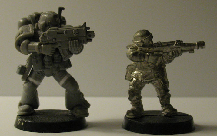 1.5mm torso card. This will probably be the final torso alteration as it gives the "standing" models a more appropriate height without compromising the proportions that the model should have or requiring extensive modification/sculpting. Sergeant and Assault models will require repositioning of the belt buckle.