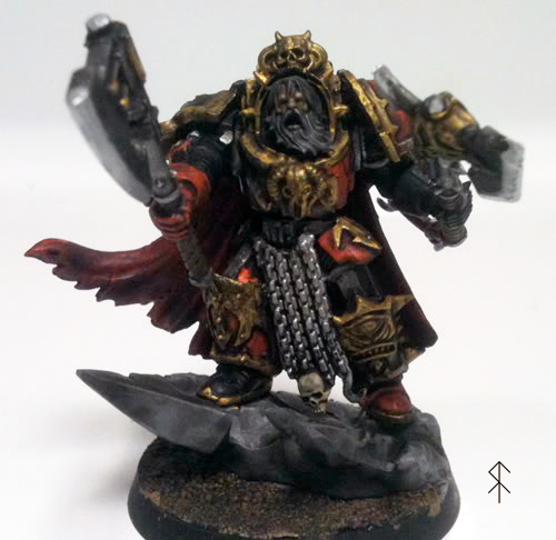 My Chaos Lord, the good Jarl, wearing his TDA and wielding his two favorite axes that normally counts-as a Daemon Weapon. I don't like the daemonic, so in the fluff he's just battle crazy and sometimes accidentally wangs himself in the face.