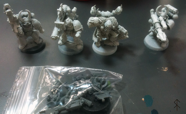 My 5 man Havoc squad start picture for the E Tenebrae Lux painting challenge the Dark Angels subforum is doing. The man in the plastic bag is my second lascannon man. One of these fellas needs an IoCG, too.