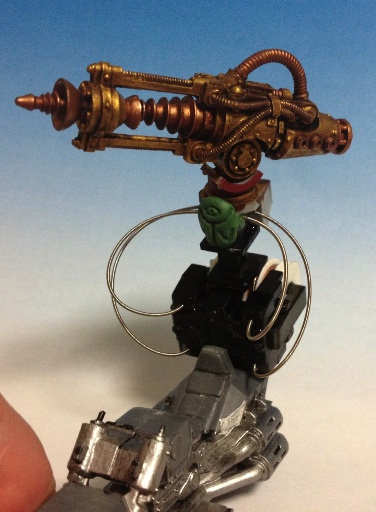 I glued the plasma and flamer in `relaxed` positions as I figure he's concentrating on the cannon, so those two arms are back and folded (and no OSL for the plasma as it's powered-down). Did add a couple of power level meters on the back. Must remember to do the Ad-Mec symbol on the back there.