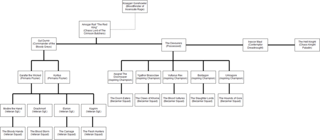 BrassClaw Posted March 17, 2016 Author Share Posted March 17, 2016 (edited) The New starting page ----------------------------------------------------------------------------------------------------------------------------------------------------------------- Warband Name: The Crimson Butchers/ The Bloody Greys Origin: Worldeaters Primary/ The Grey Regulars Colours: Red, Gold and Black/ Red, Grey and Black Home World: Unknown Location: Jager system and Demagar System (Segmentum Obscrus and Segmentum Pacificus boarder) Battle Cry: Blood for the Blood God! Butcher them all! CRIMSON BUTCHERS ICON http://i1331.photobucket.com/albums/w597/brassclaw/681a0378-42f7-465e-ac21-8a35387ae997_zpsevqe7oqe.png CRIMSON BUTCHERS COLOURS http://i1331.photobucket.com/albums/w597/brassclaw/csm.php_zpsk26bn00t.jpg BLOODY GREYS ICON http://i1331.photobucket.com/albums/w597/brassclaw/ea161129-420a-484c-bfa1-bb2760e7dcb8_zpsj4jnfhl4.png BLOODY GREYS COLOURS http://i1331.photobucket.com/albums/w597/brassclaw/imperialguard_zpsjfv29oxm.jpg HISTORY/TIMELINE: Pre-heresy: Arnogar Rull serves under the Worldeaters in the 24th assault company, and rose to the rank of captain. Horus Heresy: Arnogar Rull and the 24th helped out carry out atrocities throughout the Horus Heresy including the Isstvan V massacre, the purge of Nuceria and the Siege of Terra. 024.M31: When fleeing to the eye of terror, there ship the Gladius of Vengeance, was damaged by pursuing forces and the ship was lost in the warp. 080.M39: A Warp storm forms over the Segmentum Obscrus and Segmentum Pacificus boarder. Over 90 populated star systems of the Imperium are affected; the warp storm is named The Blood Veil. 088.M39: Gladius of Vengeance remerges from the warp, 8,000 years in the future. The Warband then lands Jager system which boarders the Segmentum Obscrus and Segmentum Pacificus lying within The Blood Veil. Arnogar and the survivors made planet fall on Jager Prime an Industrial world. Not expecting an attack, the forces are overwhelmed by the attackers. He then repurposes the world to build weapons and gear for the warband. 30,000 are killed and the remaining 20,000 are enslaved. 101.M39: Arnogar leads his warband to Jager II an Agri-world; He commands that the world be purge of life. 100,000 souls are hack to bits by the warband. The warband renamed themselves the Crimson Butchers. Arnogar is given the title “The Red King”. 110-600.M39: The Crimson Butchers continues to raid the worlds dwell in and around The Blood Veil. Populations are either enslaved or put to the torch. 725.M39: The warband “The Rippers” challenges the Crimson Butchers for the Jager system. Arnogar Rull kills the commanding warlord in single combat after 21 hours of continuous fighting. The Rippers are absorbed into the warband. 309.M40: Arnogar Rull claims the Axe of Annihilation on the Daemon World Helcright. 853.M40: In the neighbouring system of Demagar, A Khorne cult starts to form in the local populous. They call themselves the Blood Fiends of Demagar. 988.M40 Arnogar Rull makes a pact with the bloodthister Kraagarr Gorehowler. Arnogar is gifted the Juggernaut Banefang 088-090.M41: The Crimson Butchers with help from daemonic forces and the Blood Fiends of Demagar, take Demagar in a 2 year long siege. 272-277.M41: Arnogar Rull seeks out the Iron Warriors for the construction of a Lord of Skulls and other daemon engines. He finds a willing Cpt. Deion Thraxon to aid him in this task but at a price. Thraxon tasks the Crimson Butchers to aid his Iron Warriors to destroy an Imperial Fist taskforce in the Kaonus sector. The two are successful at driving out the Imperial Fists in a 5 year bloody campaign. The Iron Warriors claim the Forge World Steel Breech and destabilized the sector. Construction on the daemon engines begins 750.M41: Gul Dumir an Inquisitor of the Ordo Malleus and a task force from Astra Militarum regiment The Grey Regulars were sent out to investigate a blood cult that had been slowly expanding near the boarders of Segmentum Obscrus and Segmentum Pacificus. Gul Dumir and the Grey Regulars would find themselves caught up in The Blood Veil and stranded on an unknown desert planet. 760.M41: Gul Dumir would find a Xenos temple from what appeared to be from a long dead civilization. A spring seems to flow from within the temple, and with supplies running dangerously low, Gul Dumir drank from the spring. The spring was tainted by a heart of a long dead bloodthister. Dumir would then murder the command of the Grey Regulars and make the remaining troopers to drink from the spring, corrupting them all. 774.M41: A rescue mission was sent out to find the lost task force. The Grey Regulars rescue mission would find themselves caught off guard when they are attack by task force aided by bloodletter daemons. Gul Dumir would take over the Dauntless Class Cruiser Apocalypse Imminent force the survivors to drink from the well and rename the regiment the Bloody Greys. They would then raid the sectors and a barbarous campaign. 788-793.M41: Gul Dumir and his Bloody Greys enter the Jager system. The Blood Greys see the prize of Jager Prime and attack the Crimson Butchers. Both the forces are equally match and the fighting is bitter and hard for both sides. The fighting is interrupted by the arrival of a Space Hulk and Ork Warboss Togtak Helltrashah crashing into Jager Prime. Facing defeat at the hands of the orks, Gul Dumir and Arnogar Rull make peace and face the Warboss as a united front. They wipeout the orks with their combined arms. Arnogar Rull sees promise in the Blood Greys. He demands that Gul Dumir ben the knee and swear fidelity or continue to battle for Jager Prime. Gul Dumir, and his forces suffer heavy losses at the hands of the orks knowns that sees been outmatched. He bens the knee, see that it’s better to be alive and raiding than dead. 800-830.M41: With the alliance made, the warband seek out combat in the Vraks system. Gul Dumir and Arnogar Rull