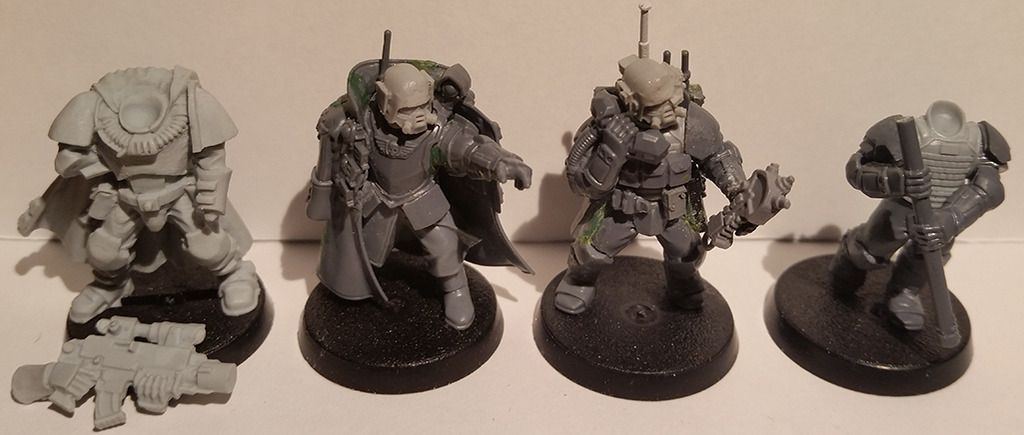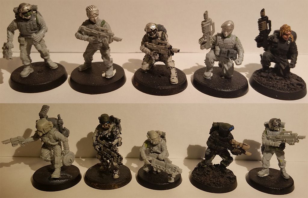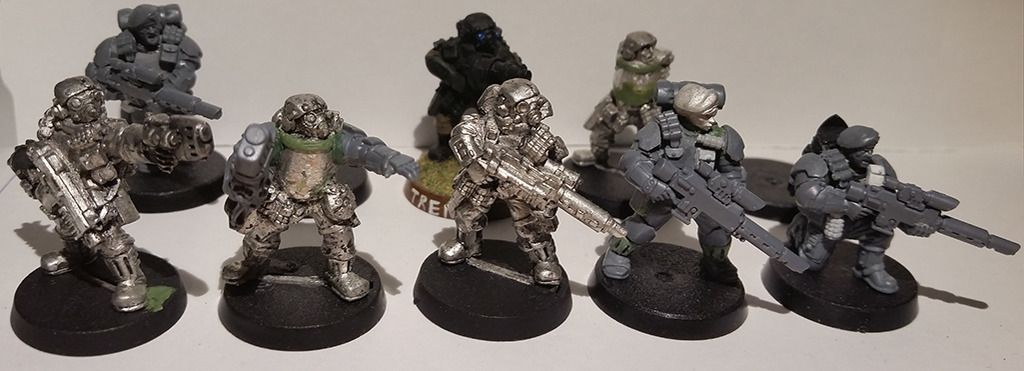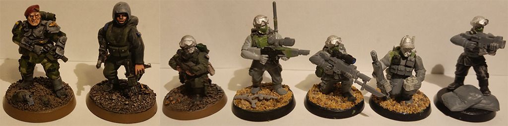 Sandy Posted March 29, 2016 Share Posted March 29, 2016 So I've recently returned to the hobby again after a lay-off for a few years due to work, I decided to catch up with the 40k community once again (barely know anyone who collects and paints nowadays). So here's my contribution! A somewhat veteran/modern inspired Imperial Guard army, mostly for time-killing with modeling and painting. Hopefully for a game or two at a relatives place in a near future. I haven't touched a brush for years, so I'm gathering my determination to start painting as soon as the weather allows basecoating outside. http://i6.photobucket.com/albums/y240/Korv/Untit4444led-2.jpg This is the planned camouflage, most of my paints have been thrown in the garbage, so if you have got any ideas what to use from the Vallejo and GW range I'd gladly appreciate it! Here's the current army list, I haven't been able to read up on the changes properly, but it's a start. I'm not sure how viable it is in its current state, but I hope it will be somewhat semi-competitive at least. Any ideas or tips would be very appreciated! Also suggestions for units that would be a great complement. HQ Company CommandCompany Commander - BoltgunMaster of Ordnance Not decided what to do with these. Elites Stormtrooper SquadSergeant - Boltgun2x Plasma Guns 1x Grenade Launcher Not sure if I should make another squad with 5 or 6 models aswell, with meltas. Troops #1 VeteransSergeant - Boltgun3x Sniper RifleHW-team Autocannon #2 VeteransSergeant - Boltgun3x Grenade launcher Eventually Chimera transport. #3 Veterans Sergeant Harker3x Sniper rifleHW-team Autocannon #4 VeteransSergeant - Boltgun3x Plasma Gun Eventually Chimera transport. Fast AttackArmoured Sentinel Squadron#1 SentinelPlasma cannon #2 SentinelPlasma cannon or Autocannon1# TaurosTwin-linked Lascannons.1# ValkyrieRocket pods & Lascannon. Here's a full showcase of what I'm working on (a bit of bluetac and WIPs):Upcoming Company Command Squad, bluetacked heads, haven't really decided what to use yet. Prefer the "Kasrkin" heads for special weapons and vehicle crews. Waiting for a bitz package to arrive, so we'll see how it ends up. Haven't decided how to equip them either. A head for the Telion model is still a mystery!http://i6.photobucket.com/albums/y240/Korv/Scions%20Command%20Veterans.jpg#1 Veteran Squad - Show off what kind of camouflage I'm planning to do, the painted models need a bit of freshen up. Rest is WIP at the moment. The radio operator might get a remake.http://i6.photobucket.com/albums/y240/Korv/Imperial%20Guard%20Veterans%204.jpg#2 Veteran Squad - First model is my Harker "count-as", I've remodeled him a bit and he needs a new backpack. The painted ones needs a bit of freshen up as well and added camouflage. Rest is WIP and awaiting clean up & basecoating.http://i6.photobucket.com/albums/y240/Korv/Imperial%20Guard%20Veterans%203.jpg#3 Veteran Squad - Same as above!http://i6.photobucket.com/albums/y240/Korv/Imperial%20Guard%20Veterans%201.jpg#4 Veteran Squad - Still a bit WIP, need to clean up a few of them and complete the HW team.http://i6.photobucket.com/albums/y240/Korv/Imperial%20Guard%20Veterans%202.jpg 1# Stormtrooper Squad - Less prioritised, keeping an eye out on eBay for a few more models.http://i6.photobucket.com/albums/y240/Korv/Stormtrooper%20Custom%201.jpgAnd at last, the sentinel and the used-to-be-HW-teambase-now-going-sentinel.http://i6.photobucket.com/albums/y240/Korv/Veteran%20Sentinel.jpgThe rest of my army is a Valkyrie and a Tauros currently under build. I've also got an old fragile Valkyrie from FW, but not sure what I'll do with it, might just let it rest as an old relic. Anyway, cheers! Comments, ideas & tips are always welcome. // Based on my old projectlog on Warseer -> http://www.warseer.com/forums/showthread.php?201108-Swebat-IS11-A-modern-veteran-inspired-IG-army - If anyone is interested in some old crappy conversions and equal. Link to comment https://bolterandchainsword.com/topic/320913-wip-swebat-veteranmodern-guard-army/ Share on other sites More sharing options...