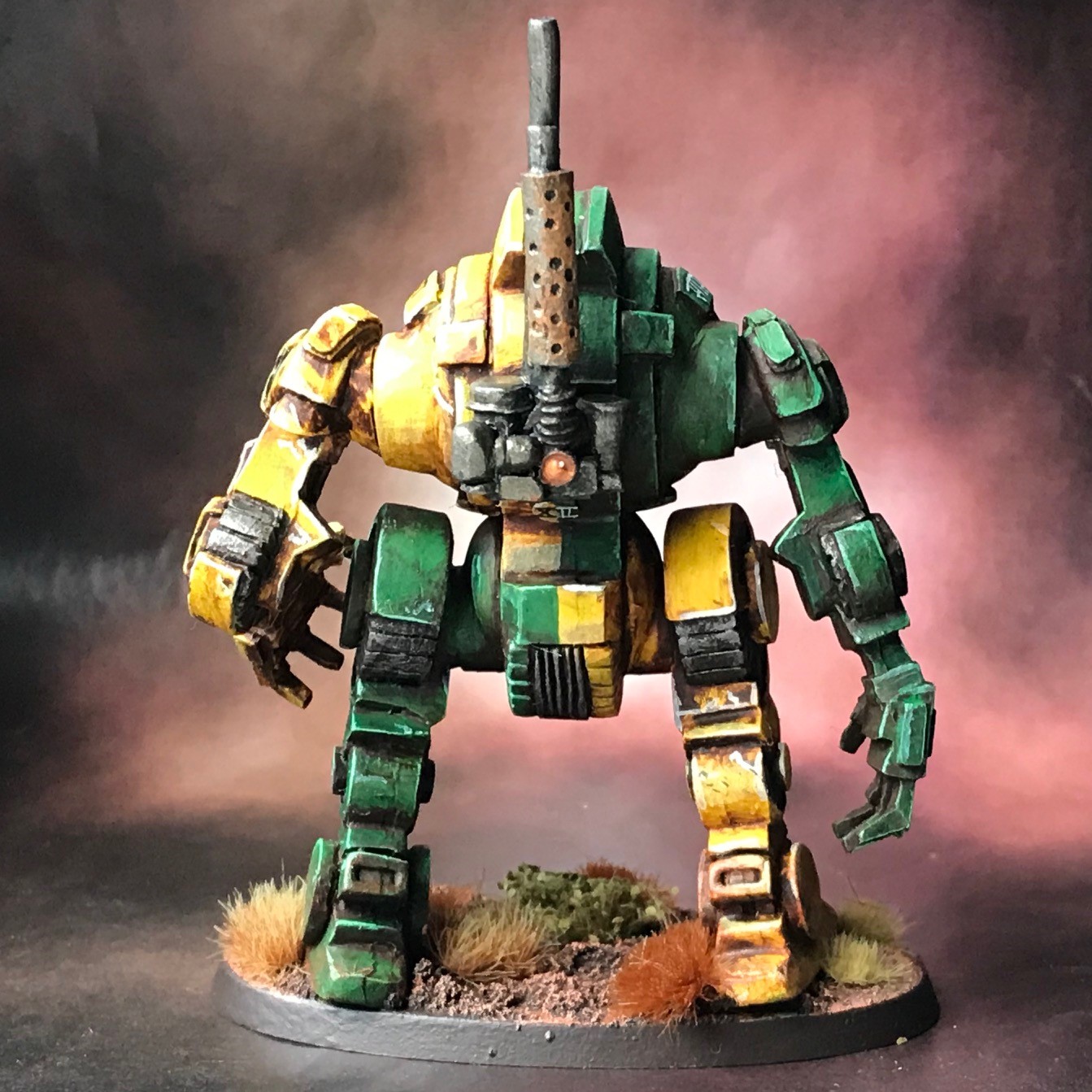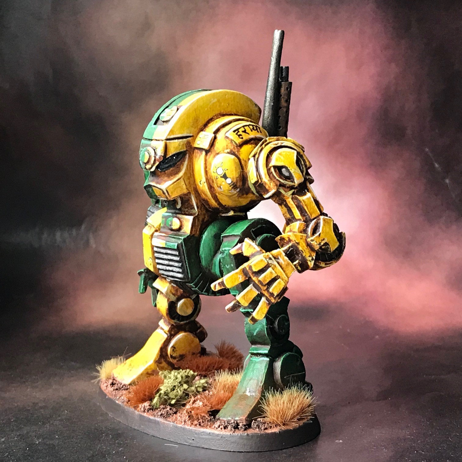 apologist Posted August 21, 2020 Author Share Posted August 21, 2020 + Painting the Dreadnought + 'The dreadnought' might be slightly impersonal, but I haven't come up with a name for our nearly-departed hero yet. I wasn't expecting him to have as much character as emerged during his story! The approach I used for the dreadnought was all-but identical to that for the infantry: lay in the flat colours (Flash Gitz Yellow and Warpstone Glow), then lay a burnt sienna oil wash over them before developing the highlights. The freehand is fairly stripped-back; simple black and white icons and text. I used some Sanskrit – and apologies for dubious translation – to get in some tongue-in-cheek puns; reading 'Dead' and 'Lost/Missing' I didn't want to overload the freehand, despite the inviting large flat surfaces, as the quartered scheme already makes him busier than he otherwise would be. I might return to add a banner. I painted the eyes gloss black. I wanted them to look deep, soulful – and dead. The ghoulish use of crippled marines is horrifying, if you take a moment to think about it, and I didn't want the Dreadnought to be too closely aligned to the infantry, instead acting as a midway point between human and warmachine. Dead black eyes seemed a nice way of doing that, making it appear almost cadavorous. The back received a hint of the orange accent colour used elsewhere, and I hinted at some discoloration of the exhaust's heat shield. The bulbous oval blisters on the front of the shoulders seemed a good place for a nameplate. I sat this in a little cartouche, to give a slight Ancient Egyptian hint. Nomus Sardauk, Dosjetka, Doghouse and 14 others 17 Back to top Link to comment https://bolterandchainsword.com/topic/364535-no-impediment-to-progress-%E2%80%93-the-gatebreakers/page/7/#findComment-5589443 Share on other sites More sharing options...