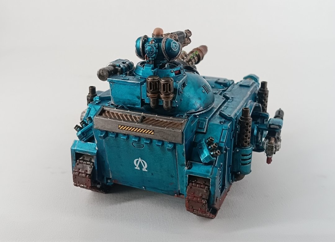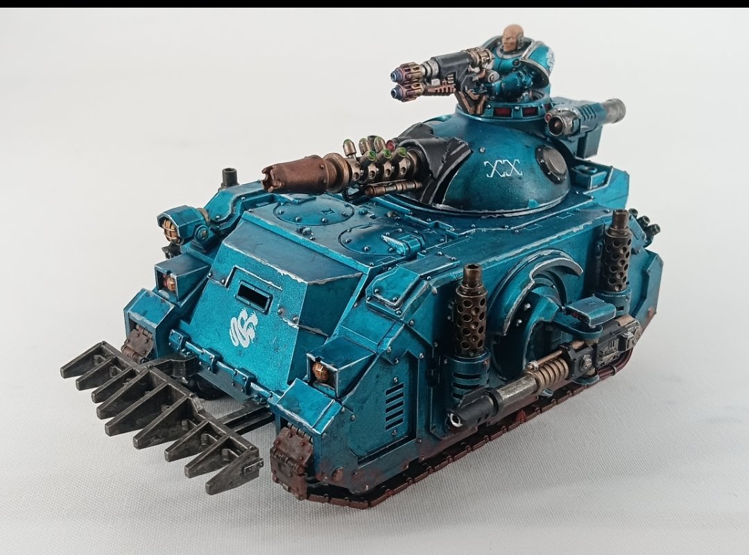 hd3 Posted September 5 Author Share Posted September 5 So I've finally finished painting the chassis, sponson guns and main gun. I went with runefang steel for the rivets and edge highlights. For the windows around the main turret and the laser sensors I used flesh tearers red over corax white. For the smoke stacks I used the same formula as my terrain, Vallejo jet exhaust followed by stippled Vallejo duralumin, then gor grunta fur thinned down by contrast medium. Finally rattling grime to make it look suitably....grimey. For the tank tracks, I wanted it to cover up some of the pooling paint and to contrast with the tank so I used a sponge to irregularly add red rust and ruddy clay along the tank tracks and the bottom of the chassis. The sponsons are just lascannons so I copied exactly what I did for my havocs except this time I used Vallejo gunmetal for the main barrel. The (conversion beamer?) Was grunta with medium on the tip of the gun with runelord brass along the rings. Finally white and warp lightning on the tips of the generator. This still isn't good enough. But it's come out better than I feared. I need to find a way to make the nuln oil gloss wash work on a model of this size and apply the blue mix evenly. Maybe borrow an airbrush and spray all over. Dr_Ruminahui, Grotsmasha and Tallarn Commander 1 2 Back to top Link to comment https://bolterandchainsword.com/topic/377633-progress-log-alpha-legion-warband-the-last-surprise/page/13/#findComment-6131003 Share on other sites More sharing options...