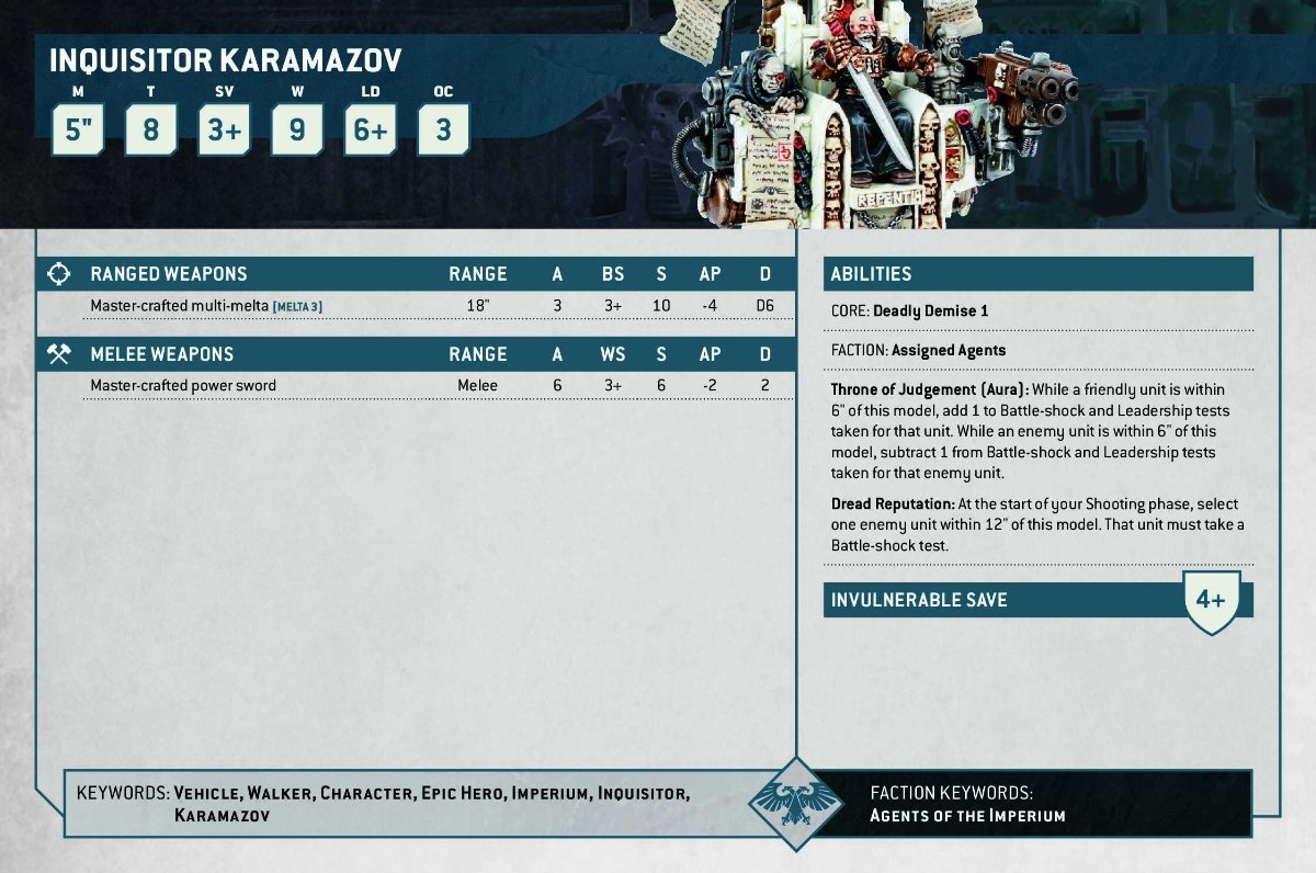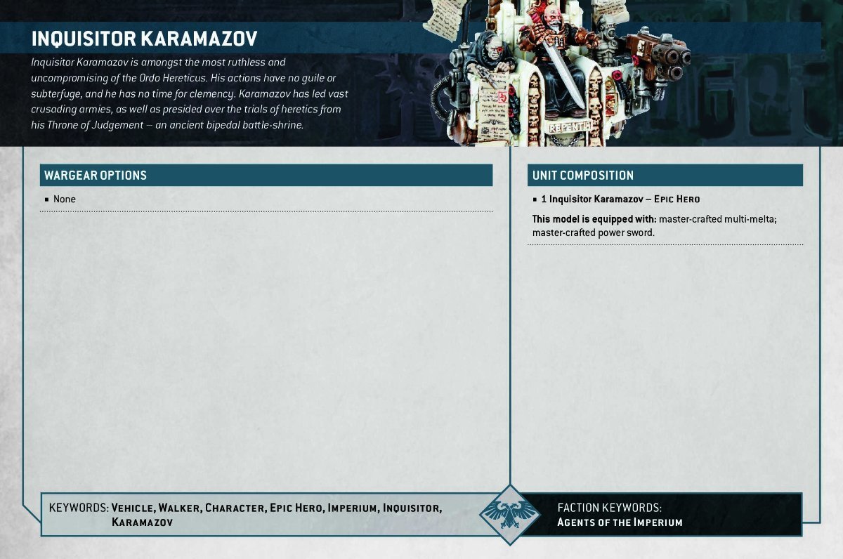 ThePenitentOne Posted 3 hours ago Share Posted 3 hours ago I'm not sure when the Legends card for Inquisitor Karamazov disappeared, but it's not in the Faction Pack for Imperial Agents. This wouldn't normally be a problem- I've been downloading and saving EVERYTHING for the entire edition, because I know GW wipes out everything when they do updates (We've always been at war with Oceania). Unfortunately, my laptop short circuited a week and a half ago. We're working on extracting the hard drive to see if any data can be salvaged. If the effort is successful, I will post the card here for the benefit of other Fraters. But I thought I'd ask if anyone else has kept the old 10th edition Legends indexes, because I know Karamazov had a card when the 10th edition dropped. W.A.Rorie 1 Back to top Link to comment https://bolterandchainsword.com/topic/386921-the-untimely-demise-of-inquisitor-karamazov/ Share on other sites More sharing options...